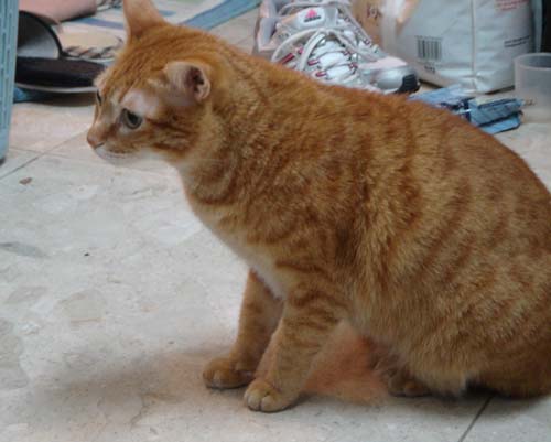有一隻很漂亮的一歲虎班貓,應該是混到阿比西尼亞貓的血統,毛色美的不像話,