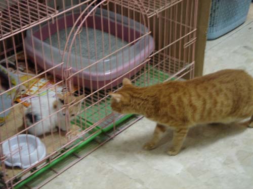 還沒隔著布之前,牠一直大哭,弄得小Myu不爽,狂哈氣!